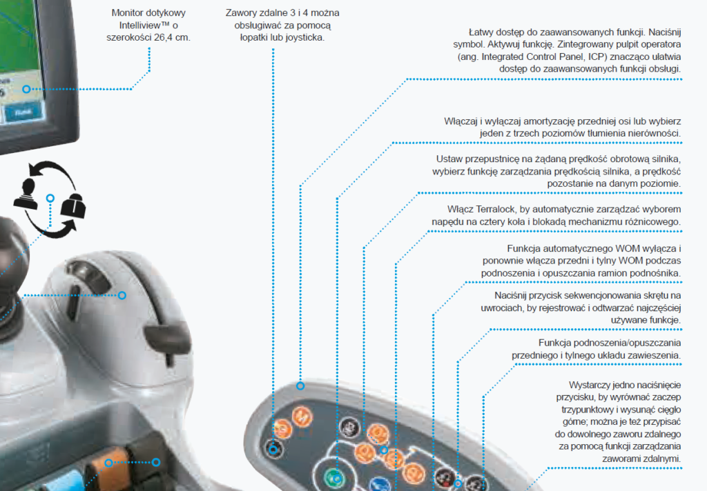 Terraglide ™ z kolei to układ zawieszenia osi przedniej, który zabezpiecza operatora przed wstrząsami podczas jazdy z dużą prędkością.