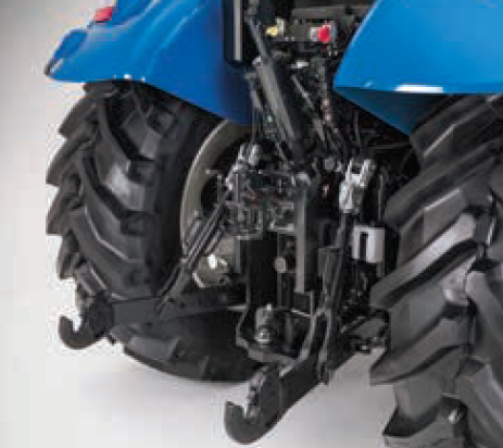 W pełni zintegrowany, montowany fabrycznie przedni układ zawieszenia narzędzi i WOM. Układ zawieszenia narzędzi i WOM mogą być sterowane z kabiny lub za pomocą elementów sterujących znajdujących się na samym układzie zawieszenia narzędzi, w celu uzyskania większej kontroli podczas podczepiania. Udźwig maksymalny to 3200 kg. Pakiet przedniego układu zawieszenia narzędzi SuperSteer™ pozwala utrzymać wąski promień skrętu, gdyż nadąża on za kątem skrętu osi przedniej. Ramiona układu zawieszenia narzędzi można złożyć, gdy nie są używane.