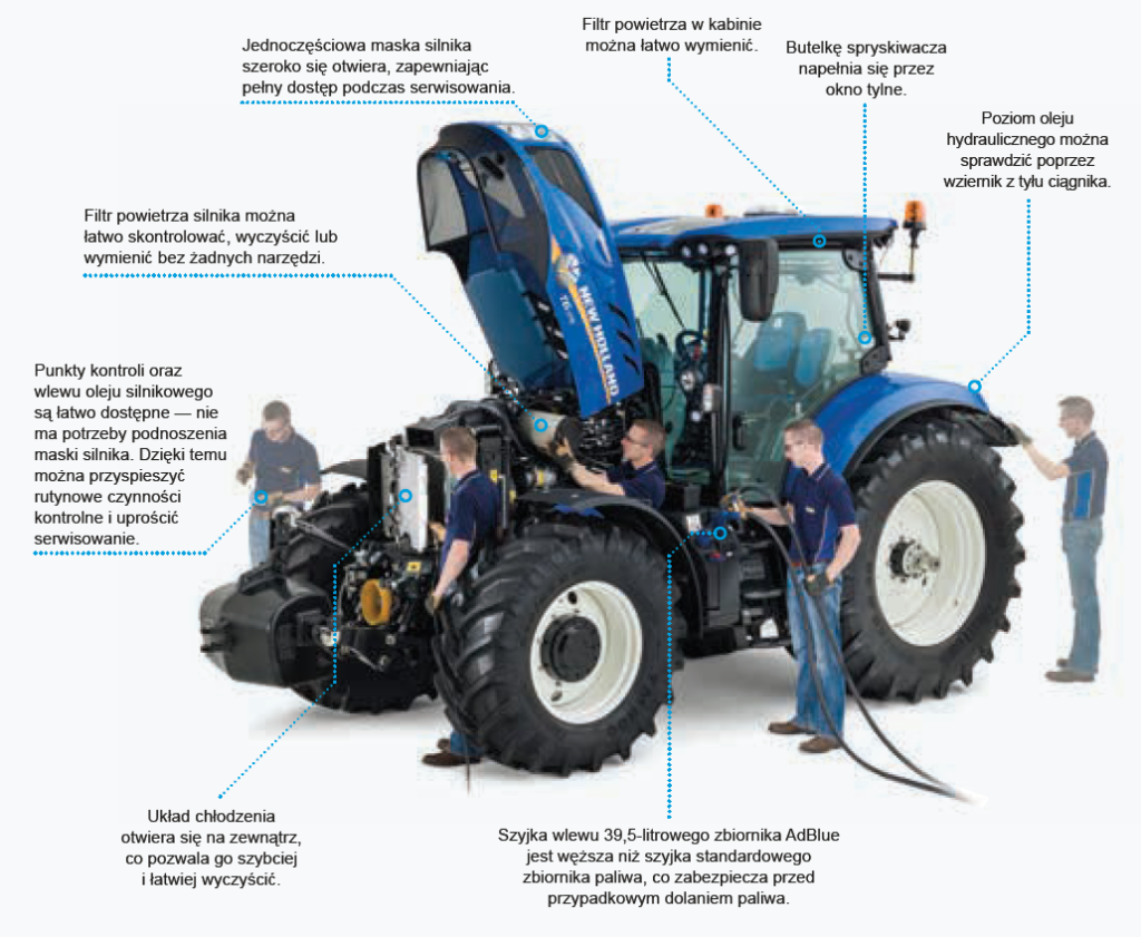 Gama modeli T6 została zaprojektowana w taki sposób, aby operator mógł poświęcić jak najmniej czasu na czynności obsługowe. Wszystkie punkty wymagające serwisowania rozmieszczono w łatwo dostępnych miejscach.