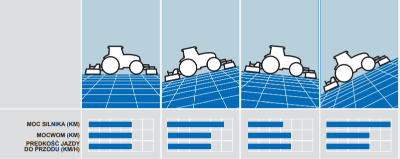 Gdy zaczyna robić się ciężko, dodatkowa moc sięgająca 27 KM zostanie wygenerowana przez silnik, gdy pracujesz z wykorzystaniem układu hydraulicznego, WOM lub podczas transportu.