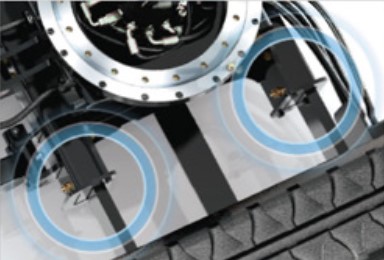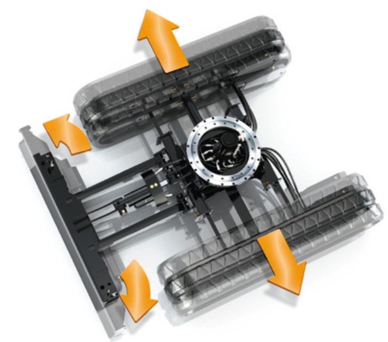 - Cicha jazda na gąsienicach jest zapewniona przez zastosowanie osłon zabezpieczających na zakończeniach gąsienic. Krótki skok gąsienic zapewnia doskonałą pracę nawet w trudnych warunkach.