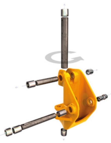 - Wymienne tuleje stalowe zastosowane w tej koparce zwiększają okres eksploatacji i optymalizują trwałość. Zabezpieczają kolumnę wysięgnika i zakończenie lemiesza oraz łyżki. Powodują, że praca jest płynna,